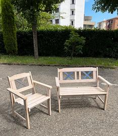 Set in legno composto da: - Poltroncina miaure L 63 cm P 58,5 cm - Sofà L 112 cm P 58,5 cm - cuscini abbinati completamente sfoderabili Nuovi, ideali da giardino/esterno.