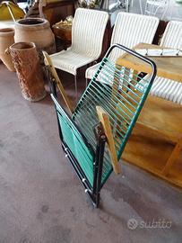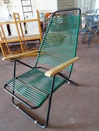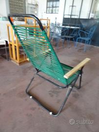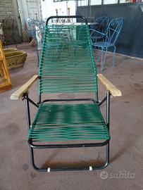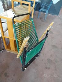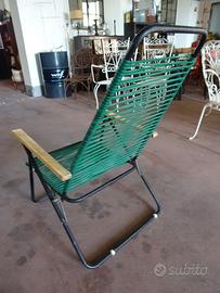 Bellissima poltroncina pieghevole vintage originale,con struttura in ferro,seduta e schienale con fili intrecciati in plastica,braccioli in legno.