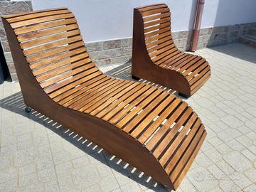 chaise longue di h 100 cm, larghezza. 70 cm, lunghezza 175 cm con ruote e poltrona di h 100 cm, larghezza 70 cm, lunghezza 92 cm con piedi di colore noce medio costruite a mano.