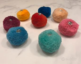 Vendi kit composto da 8 pom pom in maglia mix colori, diametro 4 cm. Hanno un gancetto che funge da spilla.
