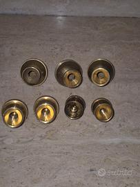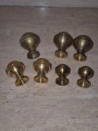 Vendo n. 7 pomelli in ottone, così suddivisi: 3 di diametro mm 35 e altezza mm 45; 2 di diametro mm 29 e altezza mm 38; 2 di diametro mm 24 e altezza mm 32. Sono tutti con filettatura cieca e lavorati con ghiera ziclinata.