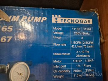 << TEL 3512165957 >> VENDO Pompa a vuoto Tecnogas Bistadio professionale con elettrovalvola e vacuometro di alta affidabilità, dotata di interruttore on/off, indicatore di livello olio, cavo di alimentazione con spina e maniglia ergonomica di trasporto. LA POMPA E NUOVA ISCATOLATA HA AAVUTO UN COSTO DI EURO 340 …….VENDO EURO 180 INTRATTABILE ..POSSIBILE SPEDIZIONE INCLUSA PER ULTERIORE INFORMAZIONI TEL