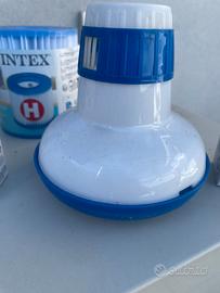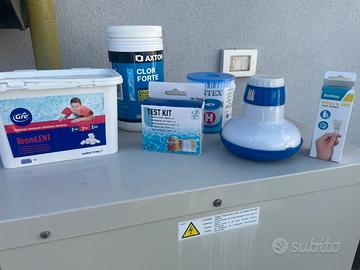 Il cloro, le pastiglie per la disinfezione dell’acqua, il galleggiante per le pastiglie e il kit per il controllo del ph.