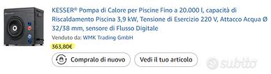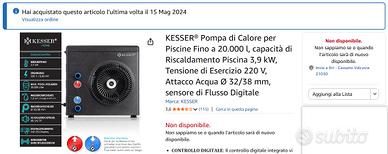 Vendo pompa di calore KESSER per piscina fuori terra, acquistata nuova nel 2024 e usata pochissimo. Comprata perchè l'albero del vicino teneva la piscina all'ombra tutto il giorno. Vendo perchè a metà stagione il vicino ha abbattuto l'albero e ora il sole è sufficiente per la mia piscina. Usata quindi due mesi scarsi nel 2024, e poi stoccata in garage inutilizzata. ✔ Potenza riscaldamento 3,9 kW ✔ Adatta per piscine fino a 20.000 litri ✔ Attacchi standard 32 / 38 mm ✔ Sensore di flusso digitale ✔ Funzionante e in ottime condizioni Perfetta per scaldare l’acqua e allungare la stagione da maggio a settembre. Oggetto amazon: B0CV17M16R Prezzo leggermente trattabile. Preferibile il ritiro a mano nel Varesotto.