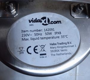 L'intensità dello spruzzo in foto è al minimo per verificare il funzionamento. Con il regolatore tutto aperto si ottiene uno spruzzo circolare in alto per circa 1 metri e mezzo di altezza. La pompa ha una capacità di 1750 litri / h è una scelta ideale per laghetti di dimensioni medie o grandi ed è equipaggiata con un motore a risparmio di energia che ha una elevata capacità ad un basso livello di consumo energetico e bassa rumorosità in funzionamento. E' fornita con un cavo di sicurezza di 10 m con messa a terra e una spina. - materiale: acciaio inox e plastica - voltaggio: 230 v, 50 hz - potenza nominale: 50 w - altezza massima: 1,6 m - profondità sommersione massima: 3 m. Messa in funzione 2 volte