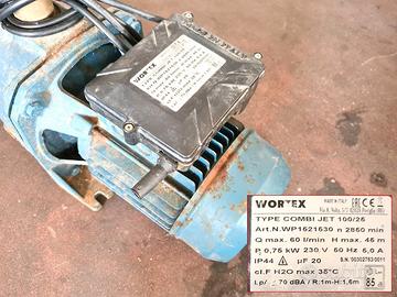 pompa per acqua Wortex usata, si tratta di una pompa ad acqua di marca Wortex mod. Combi Jet 100/25 utilizzata per l’approvvigionamento d’acqua con aspirazione da pozzi e per impianti idrici domestici. dimensioni: 45X19cm h25cm, tubo 80cm Ø4cm