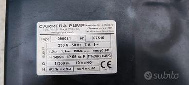 Vendo pompa per piscina CPA Carrera, usata pochissimo e in ottime condizioni, pronta all’uso. Ideale per piscine interrate o fuori terra, perfetta per chi deve riattivare l’impianto in questa stagione. 🔧Caratteristiche tecniche: * Modello: Carrera Pump (CPA) * Potenza: 1,5 CV (1,1 kW) * Alimentazione: 230V – 50Hz * Assorbimento: 7A * Portata: 19.300 l/h * Prevalenza: fino a 17 m * Velocità: 2850 rpm * Protezione: IP55 * Temperatura max acqua: 46°C * Perfetta per piscine fino a 100 mq 💧 Dotata di prefiltro con coperchio trasparente per una facile ispezione e pulizia. ✅Condizioni: * Usata pochissimo (pari al nuovo) * Sempre tenuta al coperto * Perfettamente funzionante *Unico difetto: manopola chiusura filtro 📍Ideale per: Piscine private Impianti di filtrazione domestici Sostituzione pompa esistente Inclusi raccordi visibili in foto. Ritiro a mano.