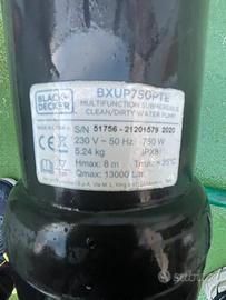Questa è una pompa a immersione Black+Decker BXUP750PTE per acque chiare e scure. Potenza: \(750\text{\ W}\). Portata massima: \(13.000\text{\ litri/ora}\).