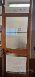 vendesi porta con doppi vetri, telaio in alluminio, colore giallo ocra, completa di maniglia e chiavi. sopra la porta c'è una finestra fissa. il telaio misura come ingombro massimo 90 cm per altezza 325, mentre la porta misura 222 cm di altezza