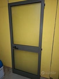 vendo porta in alluminio e vetro satinato comprensivo di telaio ,cardini regolabili, guarnizioni apertura sx a tirare colore grigio scuro tenuta benissimo .Misure in foto