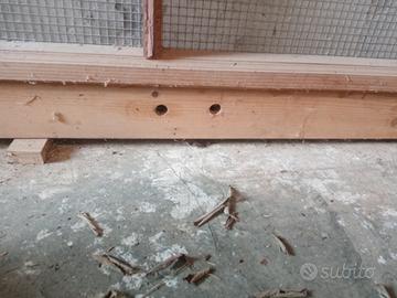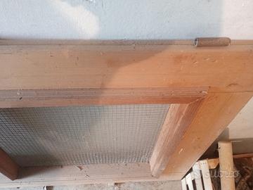 Porta da esterno in legno con doppia rete: zanzariera e rete metallica a maglia più larga. Realizzata da un falegname, ha i buchi per installare la maniglia, è adatta a pollai, magazzini, laboratori. Misure 81x223 cm. Buone condizioni. Solo consegna a mano.