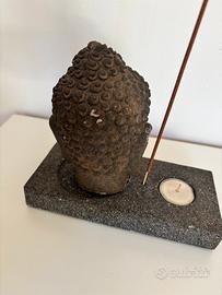 Statuetta di Buddha in pietra che funge da porta incenso e portalumino.