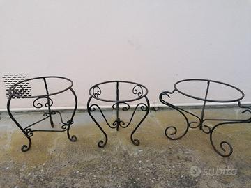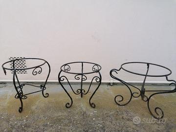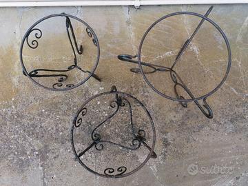 Porta vasi in ferro battuto n. 3 di varie forme. Dimensioni: 2 porta vasi hanno il diametro di 30 cm, e uno invece è 32 cm. L'altezza è 33 cm. Vendo a 30 euro ciascuno