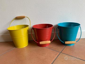 Vendo 3 porta vasi in ferro smaltato e maniglietta in legno. Dimensioni: altezza 15 cm, diametro di base 10,5 cm, diametro più alto 15 cm. Oggetto come nuovo, usato ma senza segni.