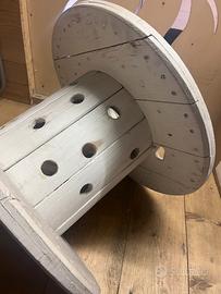 Bobina avvolgicavi in legno trasformata in portabottiglie e verniciata di colore bianco.