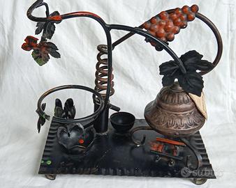 Originale portabottiglia in ferro battuto con design a tema distillatore e uva.