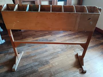 Un curioso e affascinante portabottiglie e flaconi da studio di restauro o di artista, realizzato nella prima metà del XX secolo in legno chiaro. Questo oggetto può essere reinventato anche come portabottiglie per un tavolo da pranzo, o di utilizzo in cucina o per la camera di uno studente, per gli amanti degli oggetti curiosi e carichi di sapore. Si presenta come in foto, solido e ben conservato.