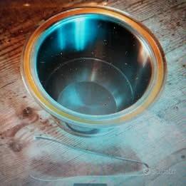 Bellissimo porta ghiaccio anni '80 in acciaio inox con profilo placato oro completo di pinza NUOVO diametro circa 20 cm