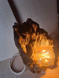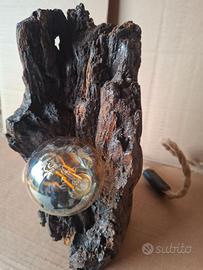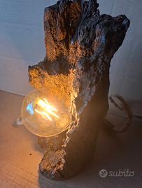 Lampada da tavolo unica, creata a mano con un pezzo di legno grezzo.