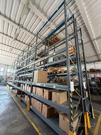 In vendita circa 30 mt di portapallet profondità 1 mt altezza 6 mt con lardoni rinforzati per portare peso, con i primi due ripiani a pianetti, compreso di para colpo giallo a terra , ad ogni spalla.