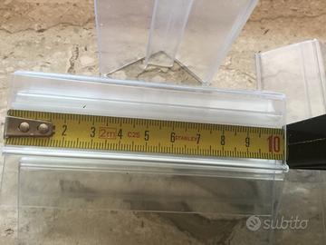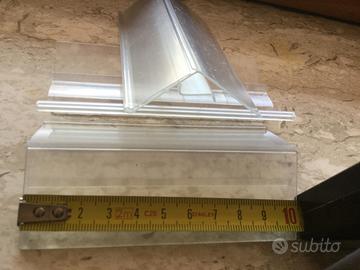 Porta prezzo in PVC trasparente ad incastro su ripiano in vetro con spessore variabile da 6 a 8 mm. Disponibili tre scatole da 50 pezzi per un totale di 150 pezzi.