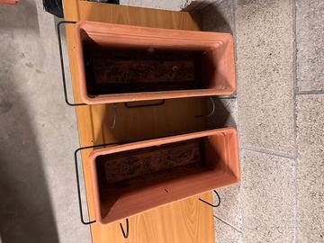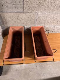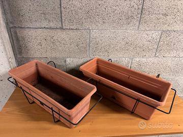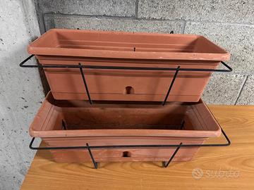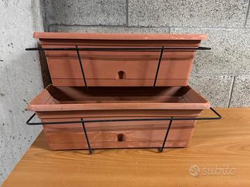 2 Portavasi da ringhiera, con vasi rettangolari da 50cm. Realizzati in metallo robusto con finitura nera, questi portavasi sono pronti per essere agganciati a ringhiere o cancellate. Vaso con cassettina raccogli acqua.