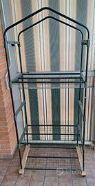 Portavasi da balcone con 4 ripiani con griglia. I tubi della struttura sono in acciaio verniciato. Le ruote sono state montate successivamente,