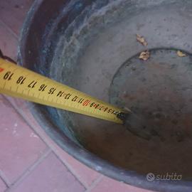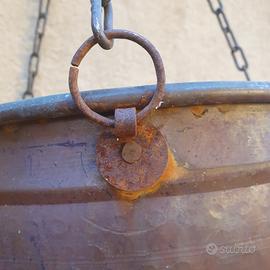 Vendo due vecchi portavaso in rame completi di catena pronti per essere appesi, sono simili ma non identici uno forse e di poco più grande e bombato dell'altro (misure in foto)