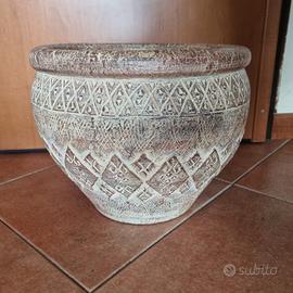 Grande e robusto portavaso cache pot in terracotta con decoro esterno, diametro dell'apertura 32 cm e altezza 25 cm.