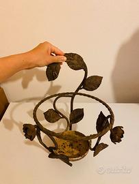 Vendo portavaso in ferro battuto, interamente lavorato a mano con decori floreali: rose e foglie arricchiscono la struttura. Ideale per ambienti rustici, balconi, giardini o interni in stile shabby chic. La patina del tempo e le leggere tracce di ruggine ne valorizzano il fascino vintage.