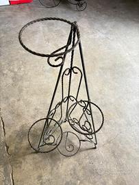 Portavaso in ferro battuto con struttura piramidale e supporti circolari mobili per tre vasi. Decorazione artigianale con riccioli e intrecci in stile rustico. Ideale per piante medie o piccole, adatto sia per ambienti interni che esterni.