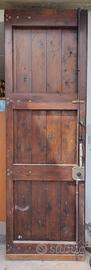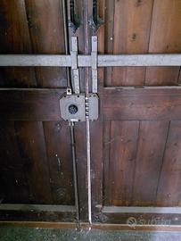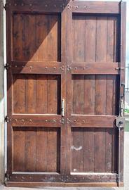 Portone in legno robusto a4 ante utilizzabile per ingressi carrai, garage o rimesse. Le quattro ante sono divise in due coppie. Possono aprirsi a libro(ripiegandosi su se stesse per occupare meno spazio) o essere indipendenti, con le due centrali che fungono da passaggio pedonale quotidiano. Materiale in essenze dure a doghe verticali, resistenti agli agenti atmosferici non so cosa sia se rovere, castagno, larice. Spessore delle ante 6,5 cm garantisce solidità ed isolamento. Ferramenta a vista con grandi cerniere lunghe, borchie e maniglioni in ferro, serratura multipunto e catenacci interni sulle ante. Permette un'apertura parziale (solo un'anta per le persone) o totale (tutte e quattro le ante per il passaggio di veicoli o carichi ingombranti). Misure interne portone: altezza cm 269 larghezza cm 347 spessore cm 6,5 Porta ad un anta in legno robusto utilizzabile come porta o portoncino. Misure interne porta: altezza cm 235 larghezza 85,5 cm spessore cm 8,5 Disponibili altre foto a realmente interessati.
