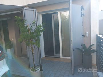 portone in alluminio quattro ante ripiegalili a.libro H. 2.40 L.2.10 completo di due su/giu di sicurezza interni su ogni anta una maniglia esterna per apertura a chiave