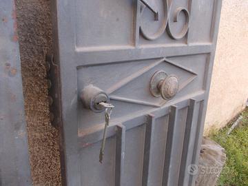 Molto robusto, serratura a 3 punti, quella centrale a 4 denti. Maniglia esterna ed interno a traversina. Anta passiva bloccata da due piantoni, alto-basso, incastranti nelle boccole. Apertura destra a spingere.