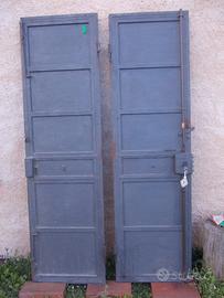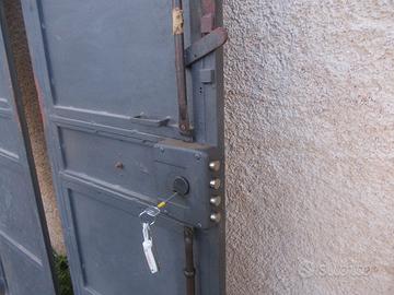 Molto robusto, serratura a 3 punti, quella centrale a 4 denti. Maniglia esterna ed interno a traversina. Anta passiva bloccata da due piantoni, alto-basso, incastranti nelle boccole. Apertura destra a spingere. Completo di telaio, da tassellare o murare. Luce netta 108 x 196. Telaio nuovo, corretto nel tratto orizzontale con traversina. Murato non si nota. Trattato con antiruggine e vernice grigio antico. Pronto per montaggio. Da verniciare il solo telaio. Consegna da valutare. Informazioni, anche al 320 948 44 22.