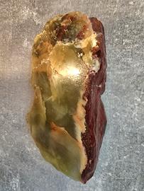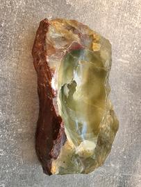 Il pezzo è caratterizzato da un affascinante contrasto cromatico: il cuore della pietra è di un verde traslucido intenso, mentre l'esterno conserva la sua crosta grezza originale in tonalità rosso mattone/ferruginosa. Dettagli: La parte interna è lucidata a specchio, liscia al tatto, ideale come posacenere, svuotatasche da ingresso o porta-gioielli. Effetto Luce: La pietra è naturalmente traslucida; se posizionata vicino a una fonte di luce o illuminata dal basso, crea riflessi spettacolari. Stile: Perfetto per arredamento Mid-Century, Boho-chic o per collezionisti di minerali. Condizioni: Ottime condizioni vintage, pezzo solido e pesante. Un pezzo unico, non industriale, ideale per chi cerca un dettaglio naturale e di carattere per la casa.