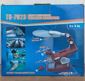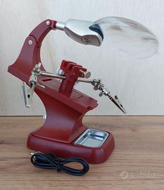 Postazione lente ingrandimento multifunzione. Illuminazione a LED. Utilizza 3 batterie 1.5 V AAA (non comprese) oppure cavetto USB in dotazione.