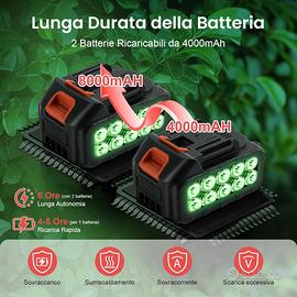 Doppie batterie da 4000mAh per un utilizzo prolungato: Include due batterie ad alta capacità da 4000mAh, che consentono sessioni di lavoro più lunghe e senza interruzioni. Che tu stia potando un grande giardino o affrontando tagli impegnativi, il sistema a doppia batteria garantisce sempre energia a disposizione, riducendo i tempi morti e aumentando l'efficienza.