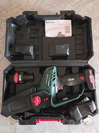 Cedo per inutilizzo potatore Parkside a batteria 12V con lubrificazione manuale della catena, completo di caricabatterie, 1 batteria da 2.0 Ah e 1 batteria da 4.0 Ah. La macchina funziona perfettamente ed è stata utilizzata regolarmente per le potature stagionali di piante ad alto fusto, senza mai dare segni di cedimento. La macchina è molto maneggevole e taglia facilmente rami fino a 8-10 cm di diametro; occasionalmente può essere utilizzata anche per diametri superiori, ma la batteria si scaricherà molto velocemente. Catena appena affilata, tendicatena riparato artigianalmente, come osservabile in foto, per rottura del suo supporto in plastica. tags: motosega, batteria, troncarami, giardino, potature.
