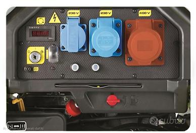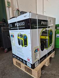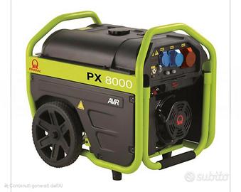 Gruppo elettrogeno PRAMAC PX8000 monofase / trifase con motore PRAMAC AP190F alimentato a benzina, capace di erogare una potenza di 6 KVA completo di regolatore di tensione AVR. Il gruppo è dotato di avviamento elettrico con batteria, ma è predisposto anche di un autoavvolgente a corda per l'avviamento manuale. L'alternatore del gruppo elettrogeno è con regolatore di tensione AVR. Grazie al suo peso molto ridotto e alle sue dimensioni compatte è comodo da trasportare dove ne hai più bisogno. Questo gruppo elettrogeno a benzina rappresenta una delle ultime novità Pramac per garantire un alto livello di qualità e prestazioni ad un prezzo interessante. Il gruppo elettrogeno PRAMAC PX8000 è compatto, efficiente e facile da usare. Caratteristichetecniche: Tipo di fase: Monofase/Trifase Potenza uso continuo monofase: 1.6 KVA / 1.2 KW Potenza massima monofase: 2 KVA / 1.5 KW Potenza uso continuo Trifase: 5 KVA / 4 KW Potenza massima Trifase: 6 KVA / 4.8 KW Motore: Pramac SR190F Giri motore: 3000 rpm Avviamento: Elettrico / Manuale Carburante: Benzina Tensione: 230 / 400 V Frequenza: 50 Hz Quadro prese: 1 x SCHUKO 230V 16A/ 1 x 2P+T CEE 230V 16A / 1 x 3P+N+T CEE 400V 16A Capacità serbatoio: 27 l Potenza acustica (LWA) dBA 97 Pressione acustica: 69 dB(A) @ 7 m Lunghezza: 727 mm Larghezza: 515 mm Altezza: 670 mm Peso a secco: 97 Kg Autonomia al 75% del carico h 13.11 Autonomia al 100% del carico h 9.82 QUADRO DI CONTROLLO Comandi: - Chiave di avviamento: OFF - ON - START Strumentazione: - Voltmetro - Amperometro