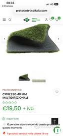 Vendo prato sintetico , nuovo per eccesso di acquisto, altezza 40 mm multidirezionale pagato 19,50 piu iva più spedizione, sono circa 60/70 Mq con la possibilità di acquistarne altro dal rivenditore che mi sono servito.
