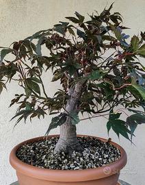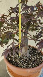 Pre bonsai di acero rosso giapponese, Acer palmatum "Atropurpureum", ovvero la varietà di acero giapponese che rimane con il fogliame rosso per tutta la stagione vegetativa, dapprima, appena germoglia, con un rosso chiaro molto acceso, poi vira gradualmente ad un rosso scuro.. pianta da diversi anni in vaso di coltivazione, il lavoro più grande eseguito su questa pianta non si vede in quanto sotto la linea del colletto, ovvero l'apparato radicale! Ha radici ben disposte e piatte che daranno un bellissimo nebari, ultimo rinvaso questa primavera. Pianta molto forte e vigorosa, sana, con possibilità di diverse interpretazioni per proseguire il suo sviluppo a bonsai.