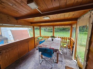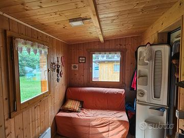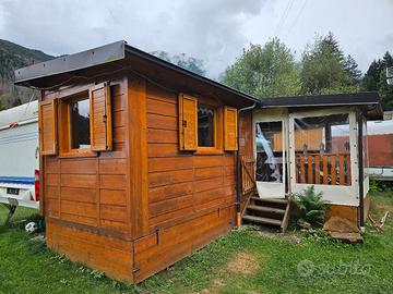 Vendo preingresso in legno coibentato 2,5 x 3 metri, completo di divano letto, impianto elettrico, stufa elettrica, finestre con doppi vetri. Esternamente: veranda di 12 mq circa, con pavimento in pvc, tende in pvc per chiuderla, tavolo in legno allungabile, tutto in perfetto stato.
