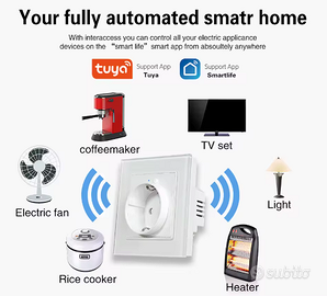 Sostituisci le tue vecchie prese con la nuova Presa a muro intelligente WiFi smart Tuya tipo C (shuko EU) + USB A + USB C. Possono essere utilizzate come la presa tradizionale o in modo smart, con controllo alimentazione da app o con controllo vocale tramite Alexa o Google Assistant. E' possibile impostare un timer per programmare gli orari di alimentazione e di spegnimento. Le prese USB rendono le ricariche degli smartphone e altri dispositivi molto più veloci rispetto ai normali caricabatterie. Le prese possono essere gestite anche da più persone tramite utilizzo dell'app gratuita Tuya o Smart Life. Materiale ABS colore bianco effetto vetro, potenza presa AC 100-240V 16A, Potenza prese USB 5V 2A, supporta WiFi 2.4 G Hz (5G non supportato). Adatto per abitazione, ufficio, hotel, bagni, garage, giardino, ecc. Installazione e configurazione semplicissima anche per i non addetti ai lavori, in allegato manuale e assistenza post vendita. Installazione semplice e manuale utente disponibile in confezione e in digitale. Assitenza post vendita per qualsiasi problema. Acquisto sicuro da impresa italiana con 100% feedback positivi.