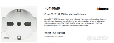 Vendo 7 pz di Presa 2P+T 16A 250Vac standard tedesco serie Bticino Axolute colore bianca codice articolo hd4140a16
