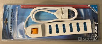 Presa sestupla con interuttore luminoso POLYPOOL made in EU . 6 prese bivalenti 10/16 A , 1,5 mt cavo H05VV-F 3x1 mm. Con spina 16 A . Massima potenza 3500 W . Nuova in confezzione , disponibilita 20 pezzi