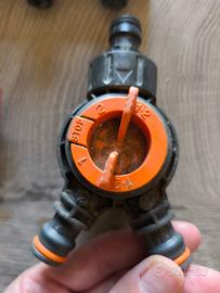 Presa a due vie arancione-nera con rubinetti di regolazione con posizioni 1, 2, 1 e 2 e stop