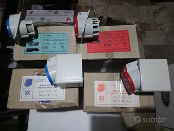 Prese industriali nuove disponibili: Presa da esterno ip44 16A 3p+T pz49 € 2,00 Presa da esterno ip44 16A 2p+T pz15 € 1,50 Presa da incasso ip44 16A 3p+T pz14 €2,00 Presa da incasso ip44 16A 2p+T pz4 € 1;50 Presa da est. curva ip44 32A 3p+T pz2 €2,50 Presa da est. curva ip67 16A 2p+T pz2 €2,00 Un eventuale blocco totale € 130,00 compresa spedizione.