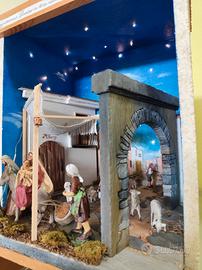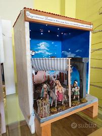 Presepe artigianale da tavolo o vetrina, completo di illuminazione a batterie e statuine. Misure 42x44x65. Peso approssimativo kg 6 senza imballaggio. Base solida in legno, struttura in polistirene. Sfondo dipinto a olio su cartone pressato. Spedizione a carico del destinatario previo accordi. Consegna a mano gratuita solo nel sud Sardegna e Medio Campidano.