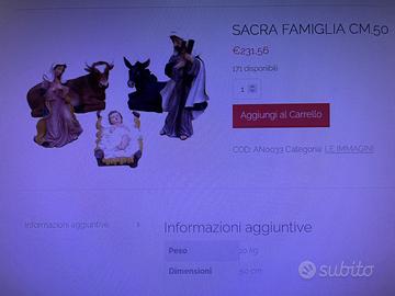 Vendo per inutilizzo presepe in resina costituito da 5 statue che riproducono la sacra famiglia. Altezza ogni statua 50cm. Possibilità di spedizione in tutta Italia. Spese di spedizione da concordare. Per qualsiasi altra informazione contattare tramite email.